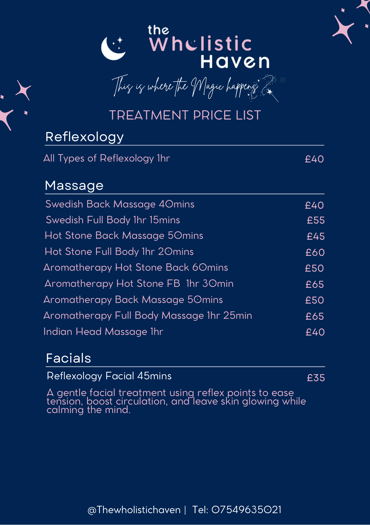 Indian Head,Holistic Facials, Reflexology, Hot stone massage, Reiki, Crystal healing, Swedish & aromatherapy full body.